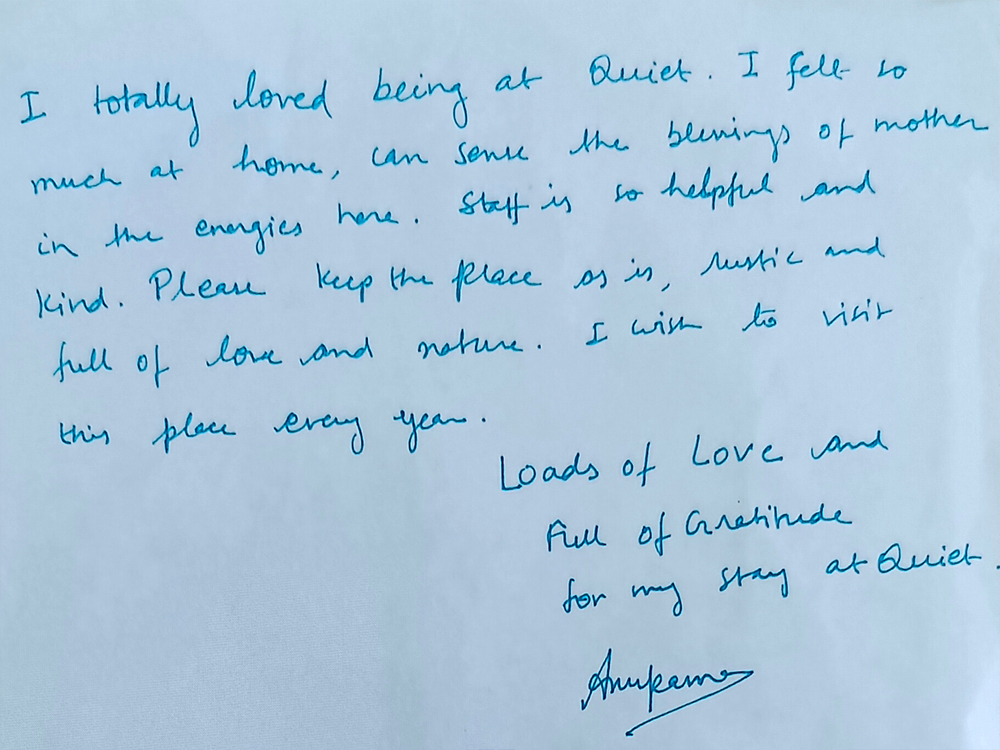 I totally loved being at Quiet. I felt so much at home, can sense the blessings of mother in the energies here. Staff is so helpful and kind. Please keep the place as is, rustic and the full of love and nature. I wish to visit this place every year.